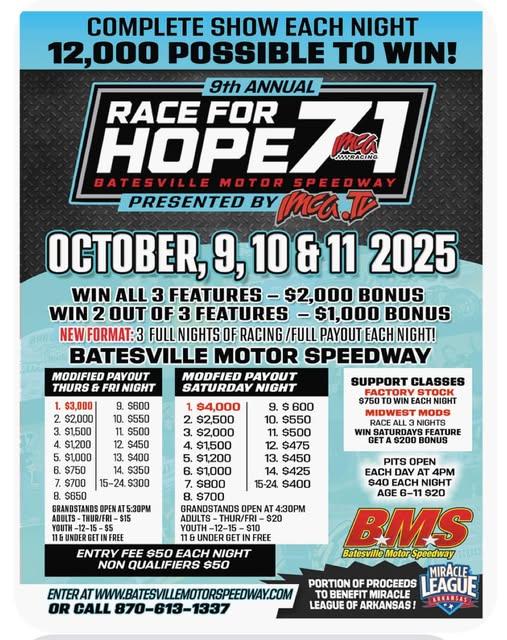 The 9th Annual Race For Hope 71 presented by IMCA-TV is scheduled for October 9-10-11, 2025 at Batesville Motor Speedway and will feature the IMCA MODIFIED division.