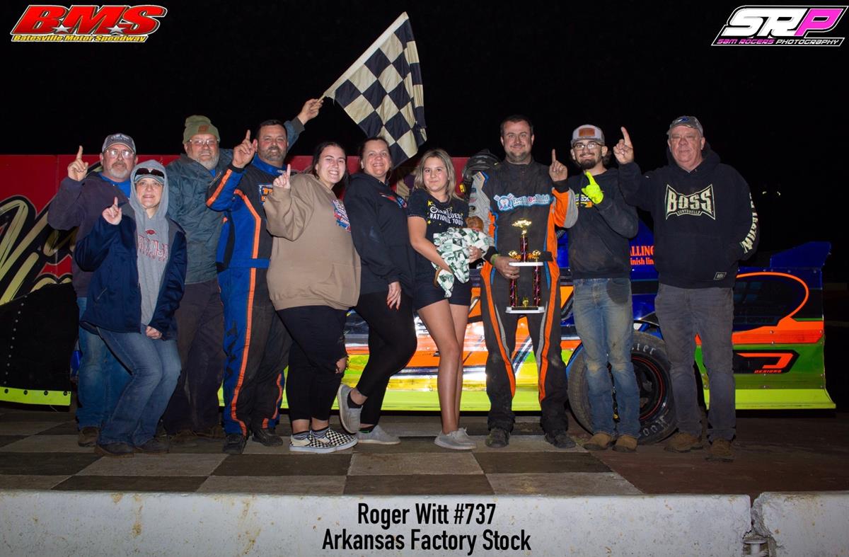 Local driver, Roger Witt took home the trophy in the Arkansas Factory Stock division. Connor Kuykendall came in second followed by Jeremy Tharp, Gavin Lowe and William Lawrence.
